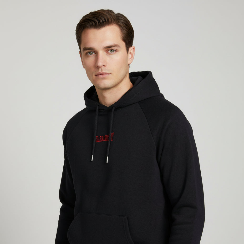 Coton 280 GSM , 85% coton biologique certifié GOTS / 15% polyester recyclé, manches raglan, bord en côtes lisses au col et au bas de manches, intérieur molleton brossé, Cordon rond, ton sur ton, avec embout de finition métal, Poche kangourou, flocage velours logo Harrington