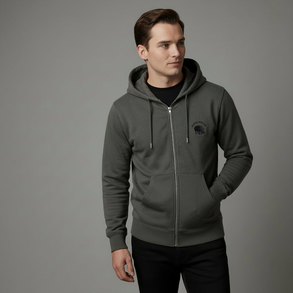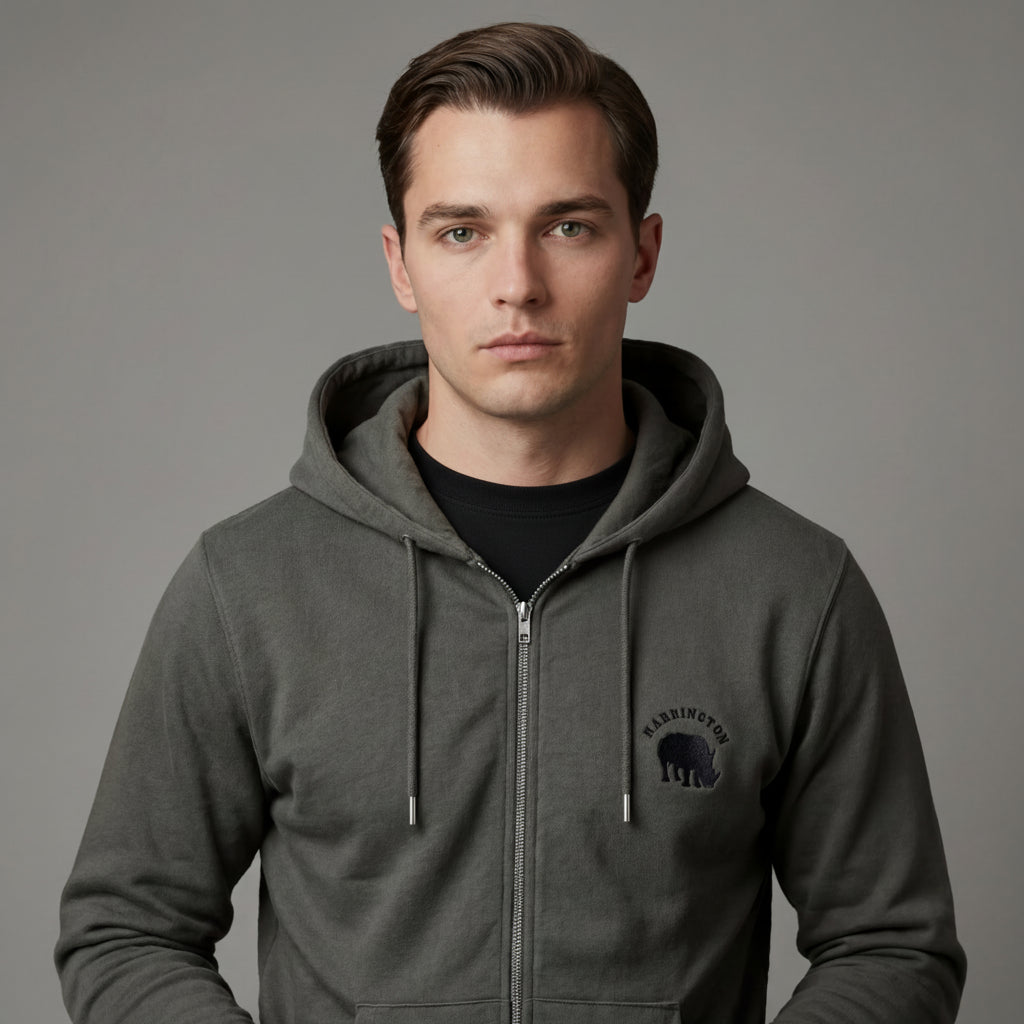 Coton 350 GSM , 100% coton biologique, manches montées, bord en côtes lisses au col et au bas de manches, intérieur molleton brossé, flocage velours Rhino Harrington sur le devant, 2 grandes poches, capuche doublée dans la matière principale, 2 cordons de serrage, embouts métalliques fermés et oeillets métalliques