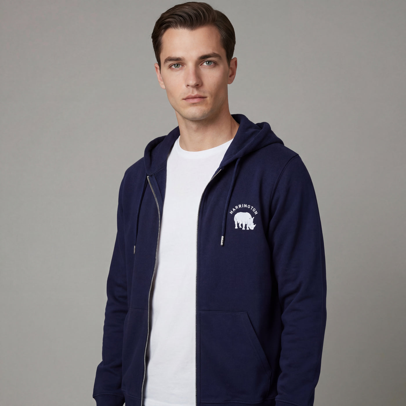 Coton 350 GSM , 100% coton biologique, manches montées, bord en côtes lisses au col et au bas de manches, intérieur molleton brossé, flocage velours Rhino Harrington sur le devant, 2 grandes poches, capuche doublée dans la matière principale, 2 cordons de serrage, embouts métalliques fermés et oeillets métalliques