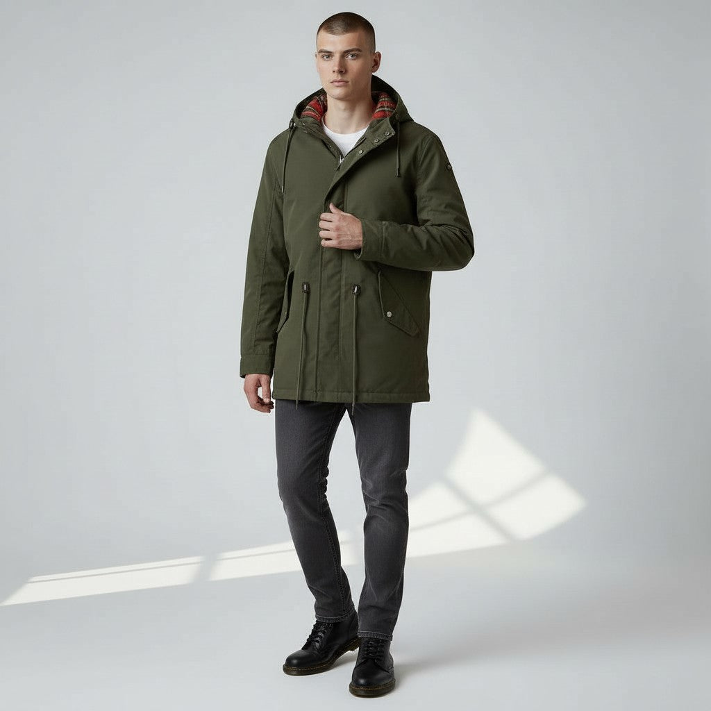 Longueur mi-long, intérieur matelassé avec doublure à carreaux écossais, col 2 boutons avec capuche fixe, cordons de serrage sur la capuche et à la taille, fermeture devant par une fermeture éclair métal YKK Harrington et des boutons pression, 2 poches à rabat avec boutons pression, 2 poches intérieures, patte de serrage aux poignets