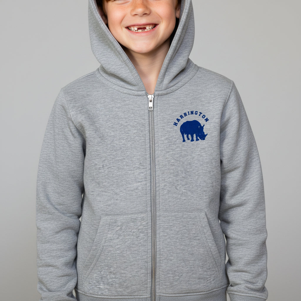Coton 300 GSM , 100% coton biologique, manches montées, bord en côtes lisses au col et au bas de manches, intérieur molleton, flocage velours Rhino Harrington sur le devant, 2 grandes poches, capuche doublée dans la matière principale.